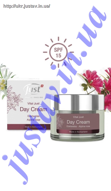 Денний крем Едельвейс/ Альпійська троянда Vital Just із сонцезахисним фактором SPF 15 забезпечує інтенсивний догляд, незважаючи на свою легку консистенцію.